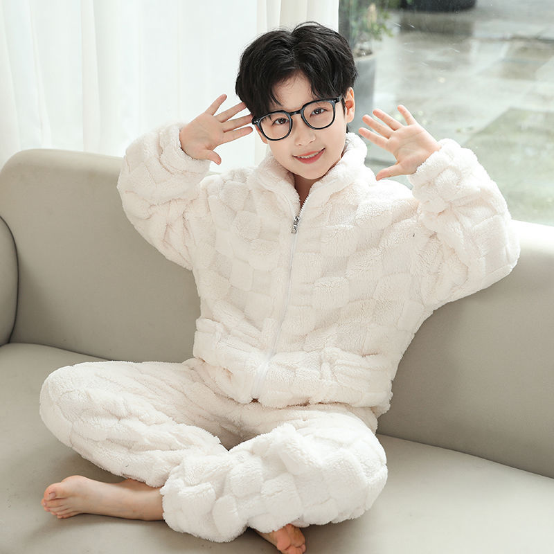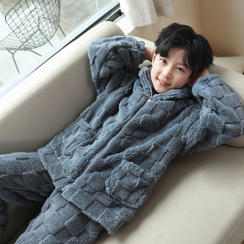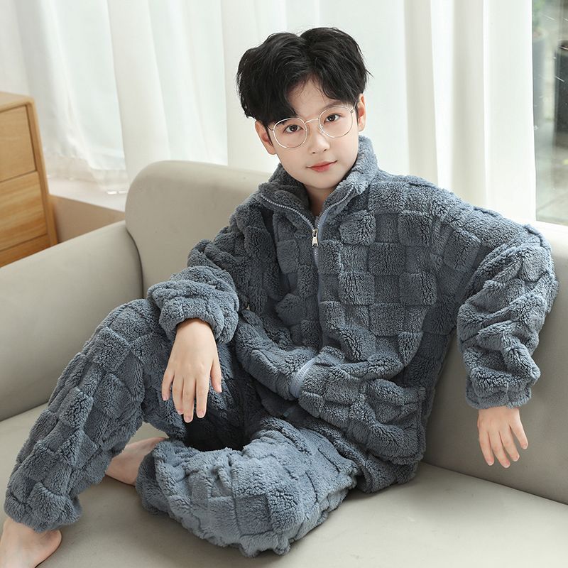 Boys pajamas children flannel outerwear suit autumn and winter plus velvet thickened home clothes